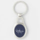 This keychain features personalized groomsman's name in white classic script font style with wedding details in white classic serif font style and monogram in light navy blue classic serif font style as background, on navy blue background.