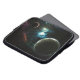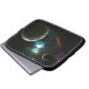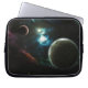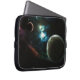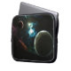 Digital-Raumkunst mit einem Planeten, einem Mond und einem Nebelfleck im Hintergrund.