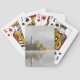 Spielkarte-Pokerplattform mit einem nebeligen Sonnenaufgang auf einem frühen Morgen mit Nebel über dem Wasser und Reflexion im Wasser der Kirche auf der Insel im See blutete, Slowenien.