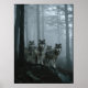 Vier majestätische graue Wölfe stehen wachsam auf einem felsigen, moosbedeckten Vorsprung tief in einem nebelverhangenen immergrünen Wald, ihre durchdringenden Augen durchschneiden den dichten Nebel. Hohe Baumstämme verschwinden in der ätherischen Dunstwolke und schaffen eine dramatische und ungezähmte Wildnis-Szene voller stiller Kraft und Geheimnis. Diese atmosphärische Wildtier-Fotografie fängt die rohe Schönheit der Wildnis ein, perfekt für Leinwanddrucke, Poster, Kissen, Handyhüllen, Tassen, Decken und Dekor, die urtümliche Waldenergie in jeden Raum bringen.