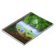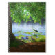 Ein friedlicher Sommernachmittag an einem ruhigen See mit Blick unter dem Schatten eines roten Ahornbaums mit seinen Ästen und grünen Blätter über dem Wasser. Wasserlililien schwimmen auf der leuchtenden Oberfläche, und ein Storch steht bewegungslos im Wasser, während Libellen und Schmetterlinge zwischen den Reisen und den Käfern, die die Bank umgeben, tanzen. Sonnenlicht glänzt und Glitzern von den kleinen Wellen im See.