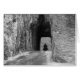 Auf einer landschaftlichen Fahrt auf der Needles Highway in den Black Hills von South Dakota kamen wir auf einen sehr niedrigen und schmalen Tunnel. Die schwarze Silhouette eines Motorrades und seines Fahrers ist durch den Needles Highway Tunnel sichtbar. Dieses Schwarz-Weiß-Foto der Felslandschaft und des Bikers wurde im Custer Staat Park aufgenommen.