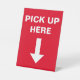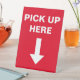 Rote Kundeninformationen Podestal-Zeichen mit dem Text "Pick Up Here" und einem weißen Pfeil. Ideal für die Lieferung von Speisen Kurierdienst oder zu gehen Kunden.