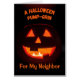 Das Zahngrin eines Jacks von Lantern ist auf dieser Halloween-Karte für einen lieben Nachbarn zu sehen. Überraschen Sie Ihren Nachbarn mit dieser niedlichen Halloween-Illustration eines Pumpgrins. Art, Bild und Vers Copyright © Shoaff Ballanger Studios, 2024.
