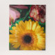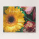Botanisches Puzzle zum Thema Puzzle mit einem Foto von bunten Blume: gelbe Gerbera und gestreifte weiße Nelken, die Hingabe, Liebe und Faszination symbolisieren. Glamour optimistisches Design. Ungewöhnliches Geschenk für jeden besondere Anlass. Sie können den Text "Es wird sonnig sein" löschen oder durch Ihre eigene Nachricht ersetzen (klicken Sie auf "Diese Vorlage personalisieren"). Für weitere Änderungen (Schriftart, Schriftart, Textposition) klicken Sie auf "Design bearbeiten".