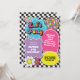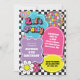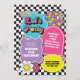 Neon 90er Jahre Retro-Geburtstagsladen mit Herz, Gänseblümchen, Diskokugel und Schachbrett-Hintergrund.