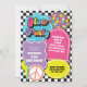 Neon 90er Jahre Retro-Glühen Geburtstagseinladung mit Disco-Ball und Schachbrett Hintergrund.