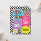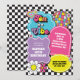 Neon 90's Retro 10 ist eine lebendige Geburtstagseinladung mit Herzen, Gänseblümchen, Diskokugel und Schachbrett Hintergrund.