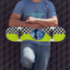 Neon Alien Checkered Skateboard Deck von BigTexFunkadelic, mit einem schwarz-weißen, karierten Druck mit einem limig grünen Hintergrund und einem blauen Spritzer Alien Kopf oben.