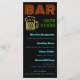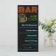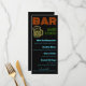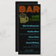 Dieses benutzerdefinierte Ereignis- oder Party-Menü verfügt über ein Neon-Bar auf schwarzem Hintergrund. Der Titel "BAR" wird oben in einem neonorangen Retro-Schriftart gedruckt. Darunter befindet sich ein Bild eines Pint Bier, gefolgt von einer Vielzahl von Probieren-Drinks und Cocktails-Zutaten.