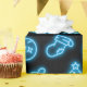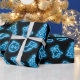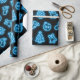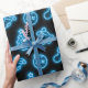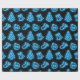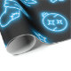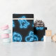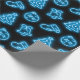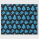 Ein nahtloses Muster von Neon Blue Weihnachtselementen, einschließlich Weihnachtsbäumen, Glocken, Strümpfen und Ornamenten auf schwarzem Hintergrund