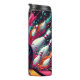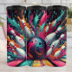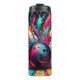 Dieses dynamische und lebendige Bild erfasst einen Bowlingball, der mit einem explosiven, farbähnlichen Splash Buttone trifft. Der Bowlingball selbst ist eine wirbelnde Mischung aus Blau, Rosa und Schwarz. Weiße Bowling-Button mit roten Streifen sind nach außen verstreut, umgeben von blühenden, mehrfarbigen Spritzern in Rosa, Orange, aquamarin und Blau. Die Bowling-Spur im Vordergrund wird mit leuchtenden, gestreiften Farben gerendert, das ganze Set vor einem dunklen Hintergrund und schafft einen auffälligen visuellen Effekt.