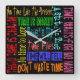 Eine wirklich einzigartige Wanduhr mit verschiedenen Redewendungen über die Zeit, wie zum Beispiel "Zeit fliegt" oder "Zeit ist Geld" und so weiter, jede in einer anderen Schrift in sehr hellen Farben auf schwarz. Blaue Punkte kennzeichnen die Stunden.