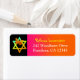 Dieses orangefarbene, rosa und schwarze Adressetikett hat einen orangen und gelben Neonschmetterling und einen David-Stern darauf, der mit der unten gezeigten Bat Mitzvah-Einladung übereinstimmt.