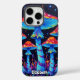Dieses Gemälde zeigt eine Reihe fantastischer Pilze, die mit lebhaften Neonfarben vor einer dunklen, sternigen Kulisse leuchten. Das Kunstwerk zeichnet sich durch seine schwere Impasto-Textur aus, mit dicken, ausdrucksstarken Pinselstrichen, die den Pilzen ein dreidimensionales, fast skulptiertes Aussehen verleihen. Die Pilzkappen sind eine brillante Mischung aus Rot und weißen Flecken, die zu blauen Unterseiten wechseln, während ihre Stiele wirbelnde Muster von Blau und Rosa zeigen. Die umliegende Vegetation leuchtet auch in Neontönen, was eine psychedelische und andere Weltszene schafft