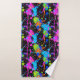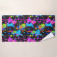 Cool Neon Colorful Pattern Bath Towel. Paint splatter pattern in black, fluro pink, blue, orange, neon lime green. Cheerful retro 90s/80s feel - great way to add a ‘splash of color’ to your day.