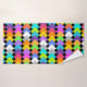 Dieses Handtuchhandtuch ist mit einem rosa Waschtuch, einem lila Handtuch und einem Badehandtuch mit einem geometrischen Design aus Neondiamanten versehen, das sich auf einem schwarzen Set überlagert.