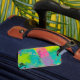 Ein lebhafter Bruch von Elektrofarben und Schablonenformen, die in reinem künstlerischen Chaos über die Leinwand tanzen. Frische Magentas, gelbe elektrische Blues, türkisfarbene und tiefe, harmonische Paare. Geschlossene Farbtexturen, Spiralmotive und fließende Formen schaffen ein energetisches Stück, das das Wesen der schöpferischen Freiheit und des künstlerischen Ausdrucks erfasst. Personalisieren mit einem Namen.