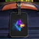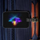 Antikes, mechanisches Feuerwerk mit Glühbirne und dünnen Flügeln glänzt orange, lila, türkis auf schwarzem Hintergrund. Steampunkstil.