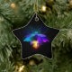 Antikes, mechanisches Feuerwerk mit Glühbirne und dünnen Flügeln glänzt orange, lila, türkis auf schwarzem Hintergrund. Steampunkstil.