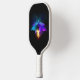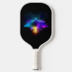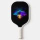 Antikes, mechanisches Feuerwerk mit Glühbirne und dünnen Flügeln glänzt orange, lila, türkis auf schwarzem Hintergrund. Steampunkstil.