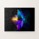 Antikes, mechanisches Feuerwerk mit Glühbirne und dünnen Flügeln glänzt orange, lila, türkis auf schwarzem Hintergrund. Steampunkstil.