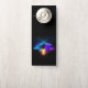 Antikes, mechanisches Feuerwerk mit Glühbirne und dünnen Flügeln glänzt orange, lila, türkis auf schwarzem Hintergrund. Steampunkstil.
