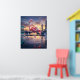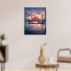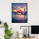 A striking neon flamingo stands elegantly in shallow reflective water at a futuristic marina. Metallic feathers, glowing contours, and radiant pink, coral, magenta, cyan, and gold tones create a luxurious tropical look. Glass docks, sleek yachts, skyline towers, soft ripples, lantern lights, and warm sunset haze surround the poised bird. This stylish futuristic flamingo design blends glamour, serenity, and coastal sophistication, perfect for modern interiors, beach homes, bedrooms, and gifts for bird or travel lovers.