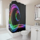 Mehrfarbige Neonleuchten, die in einem Kreis auf einem schwarzen Duschvorhang eingewickelt sind. Es gibt weitere passende Badzubehör.