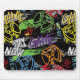 Ein lebendiges, nahtloses Vektormuster mit tropfenden Graffiti-ähnlichen Spielcontrollern, urbanen Pinselstrichen und "Jetzt spielen"-Typografie auf dunklem Hintergrund.