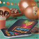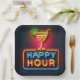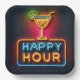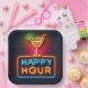 Helle Neonleuchten zeigen die Meldung "Happy Hour" und Cocktailgrafik auf einem Backsteingebäude