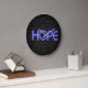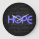 Lila blaues Neonhoffammelzeichen an der urbanen Ziegelmauer.