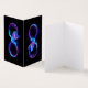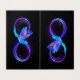 Glühendes, lila Unendlichkeitssymbol mit fliegendem, leuchtendem, blauen Kolibri auf schwarzem Hintergrund. Neon.