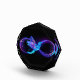 Glühendes, lila Unendlichkeitssymbol mit fliegendem, leuchtendem, blauen Kolibri auf schwarzem Hintergrund. Neon.