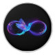 Glühendes, lila Unendlichkeitssymbol mit fliegendem, leuchtendem, blauen Kolibri auf schwarzem Hintergrund. Neon.
