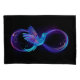 Glühendes, lila Unendlichkeitssymbol mit fliegendem, leuchtendem, blauen Kolibri auf schwarzem Hintergrund. Neon.