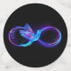 Glühendes, lila Unendlichkeitssymbol mit fliegendem, leuchtendem, blauen Kolibri auf schwarzem Hintergrund. Neon.
