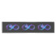 Glühendes, lila Unendlichkeitssymbol mit fliegendem, leuchtendem, blauen Kolibri auf schwarzem Hintergrund. Neon.