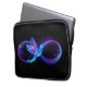 Glühendes, lila Unendlichkeitssymbol mit fliegendem, leuchtendem, blauen Kolibri auf schwarzem Hintergrund. Neon.