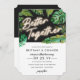 Diese lustige, moderne Hochzeitsinsel-Einladung enthält Neonlampen, die "Better Together" (Besser gemeinsam) und tropische Blätter lesen. Die Hintergrundfarbe kann auf Wunsch angepasst werden.