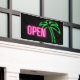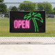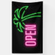 Neonrosa "Open"-Text mit neongrüngrüner tropischer Palmenbaum-Silhouette auf schwarzem Hintergrund macht dies zu einem großartigen Design für Privatpersonen und eine Vielzahl von Einzelhandelsgeschäften und Unternehmen