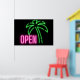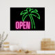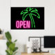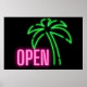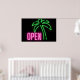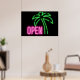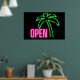 Neonrosa "Open"-Text mit neongrüngrüner tropischer Palmenbaum-Silhouette auf schwarzem Hintergrund macht dies zu einem großartigen Design für Privatpersonen und eine Vielzahl von Einzelhandelsgeschäften und Unternehmen