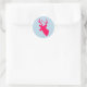 Eine neonrosa Silhouette eines Hirschkopfes ist auf einem hellblauen Hintergrund mit dünnen, weißen Zickzack Streifen.