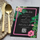 Ein modernes und dennoch Retro-Thema Neon rosa tropischen botanischen Botanicals auf einem schwarzen Hintergrund. Ein schönes Hochzeitsdesign, ideal für den Sommer. Die tropischen Pflanze in Neonrosa sind mit Palmen, Blume aus rosafarbenem Hibiskus und Blume aus Plumerias Frangipanis gestaltet. Schwarz, Rosa und Grün dominieren dieses tropisch-rosa Neondesign. Die moderne kalligraphische Typografie kontrastiert perfekt mit dem schwarz-rosa Hochzeitsdesign. Ein elegantes Hochzeitsdesign Save the Date Kartendesign mit modernen, einfachen Elementen. Es stehen auch passende Hochzeitsstilleriedateien und andere Hochzeitsformate zur Verfügung.