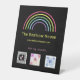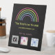 Bleibe mit Kunden oder Gruppen, die dieses Tafelpodestzeichen verwenden, das eine Neonregenbogen-Grafik mit anpassbarem Text und QR-Codes für Social Media auf schwarzem Hintergrund enthält