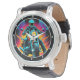 This watch face features a dynamic graphic of a motorcyclist in a helmet, riding a bike against a vibrant backdrop of neon blue, pink, and orange wings or flares. The design has a futuristic, almost comic-book style. White numbers and watch hands are clearly visible, creating a bold and energetic accessory for motorcycle enthusiasts.