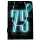 Glühende 75 Neon-Zeichen auf dunklem Backstein Wand Hintergrund mit einem transparenten Aqua-Ballon für einen 75. Geburtstag.