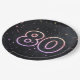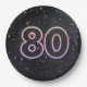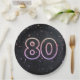 Glühendes Neonzeichen auf schwarzem Hintergrund mit Konfetti für 80. Geburtstagsfeier.