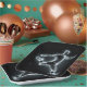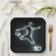 Glühender Neonfußballspieler auf schwarzem Hintergrund, der den Ball mit energiegeladenen, glitzernden Lichtspuren-Effekt kippt