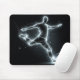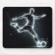 Glühender Neonfußballspieler auf schwarzem Kicken des Balls mit glitzerndem Lichtrails